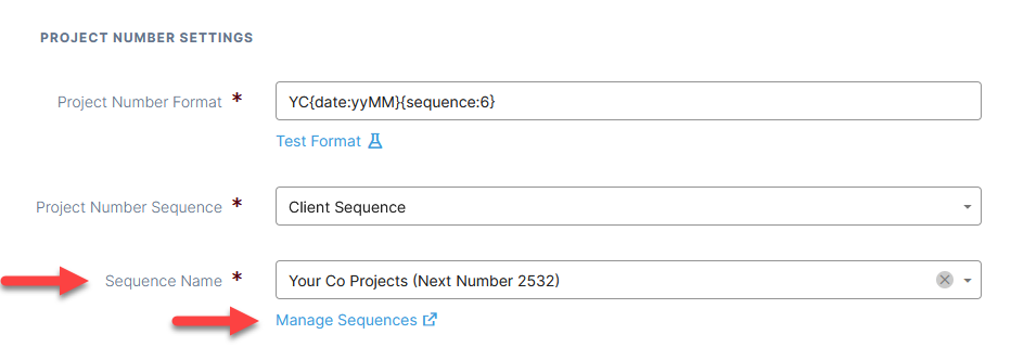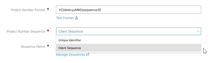 - Under Sequence Name select a sequence rule that you have created that will automatically number the projects. These rules are managed under Manage Sequences (See instructions in the next section below).