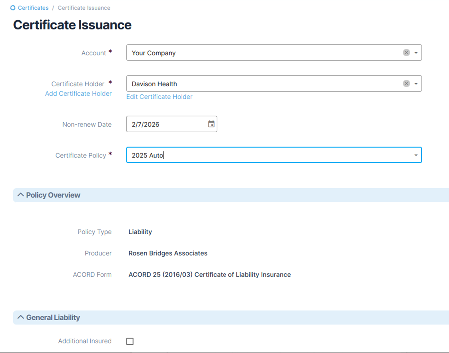- Fill out the remaining sections. The policy you selected under Certificate Policy, along with information specified on the ACORD form used, will determine which other sections require data.