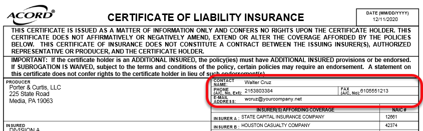 The user name and contact information provided in Your Account will appear as the Producer contact information on the certificate. It will include the user name, work number, fax number, and email address.