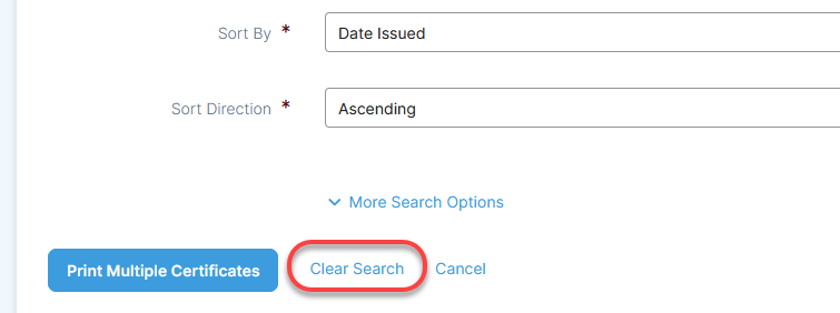 - Click More Search Options if you need to search by any of these criteria: Certificate Number (single or multiple, comma-separated), Certificate Number Range, Certificate Holder, or Issued By User.