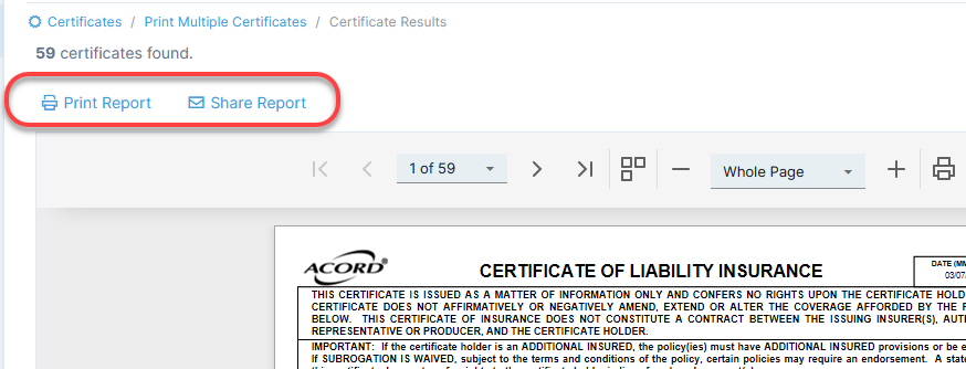 - On the preview page, click Print Report to print your certificates or Share Report to send by fax or email.