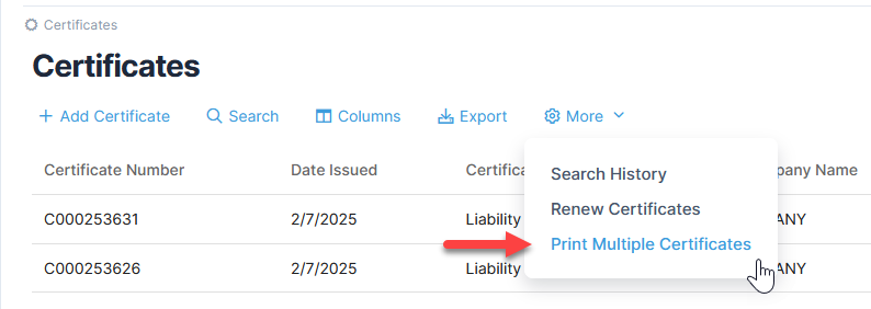 You can print multiple documents at once rather than opening each individually. You can search for the certificates using different criteria. If you need only one document, you can use the Print Multiple Certificates for single certificates as well.