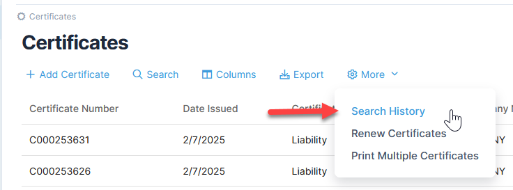 Search History enables you to search for certificates using criteria such as the certificate number, date issued, type of certificate, or any certificate under a specific account.