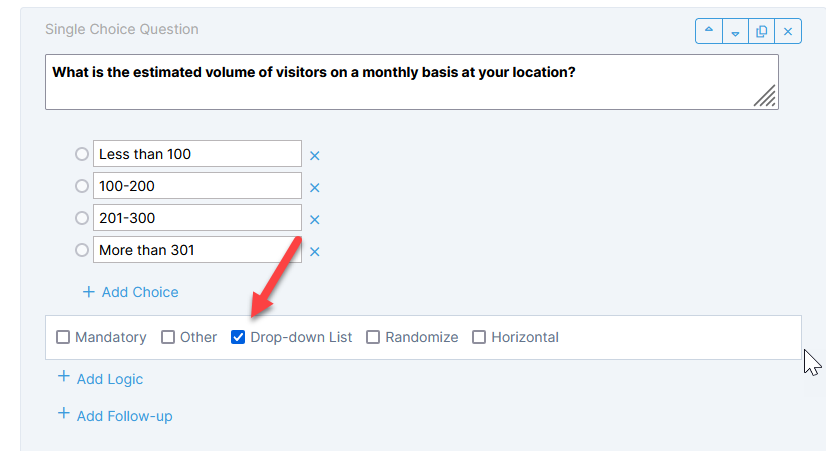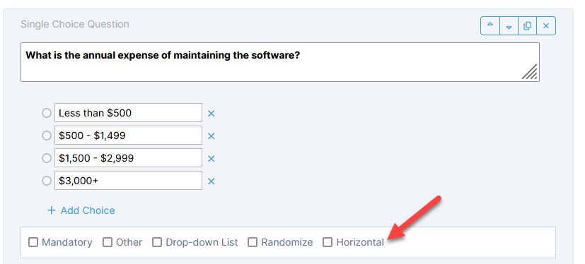 This question, which allows for only one answer, uses radio buttons for each option. Options are shown in a vertical list by default but different display options are also available.
