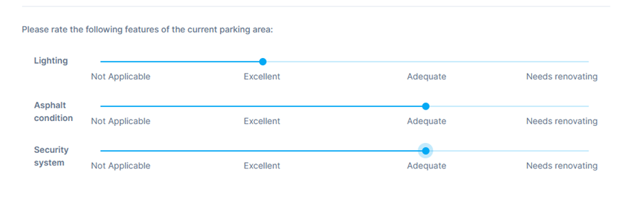 The slider question is similar to the matrix question, but with a different format. Answers are presented as a list of criteria with a sliding bar to rank each criteria.