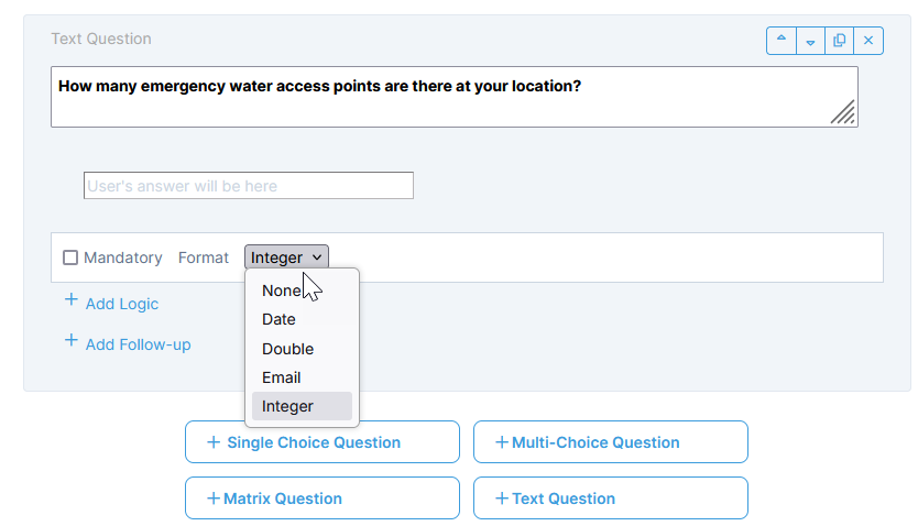 The text question allows survey participants to provide specific information or additional details. Quadra provides format options aside from the default of "None" if the question requires a certain type of information.