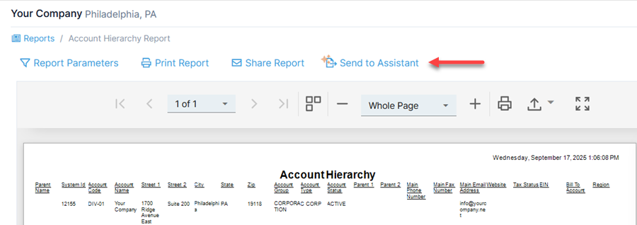 - Once the report is visible, click Send to Assistant above the window. You will have the option to select a PDF or Excel format. For quantitative analyses, Excel is recommended.