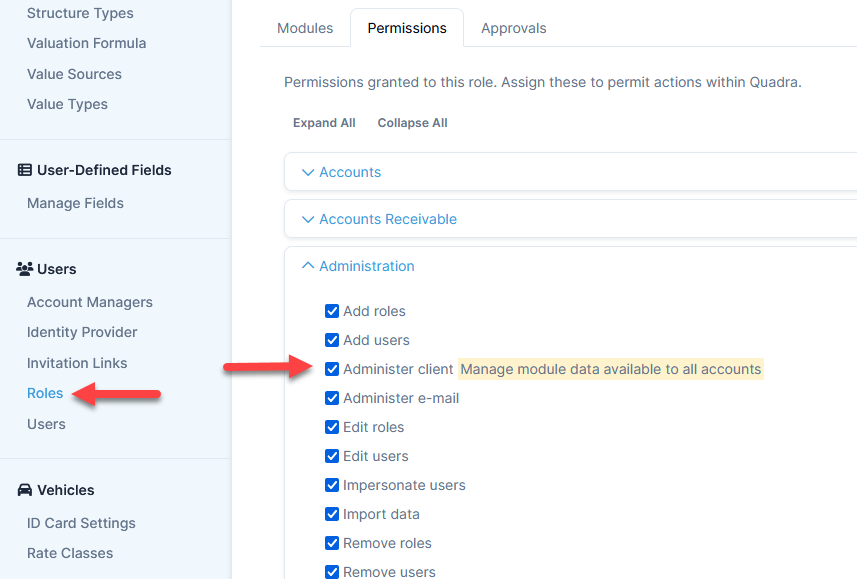 The 'Administer Client' permission can be selected for a Role in the Administration module, under the Users menu.