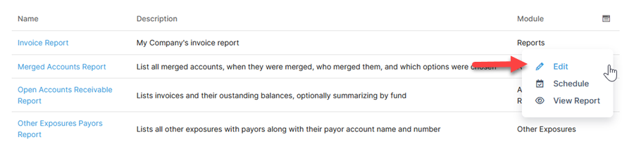 The Edit function can be accessed either as a grid action or from the view mode. Clicking Edit will open Report Builder in Administration.