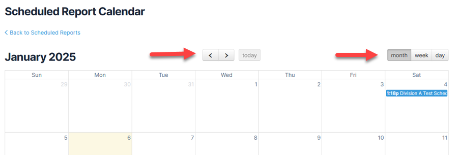 The Scheduled Reports Calendar provides you monthly, weekly, and daily views of the reports you have scheduled. You can also use the calendar to access your reports for editing.