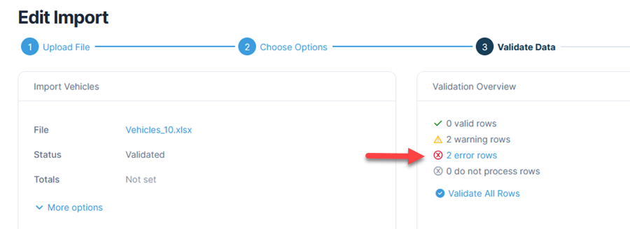 - In the Validate Data section, go to the Validation Overview. Select the overview error link, next to the red X icon.