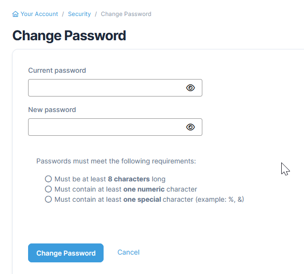 - On the Change Password form, type the Current Password. Click the eye icon at the right to unmask the password if needed.