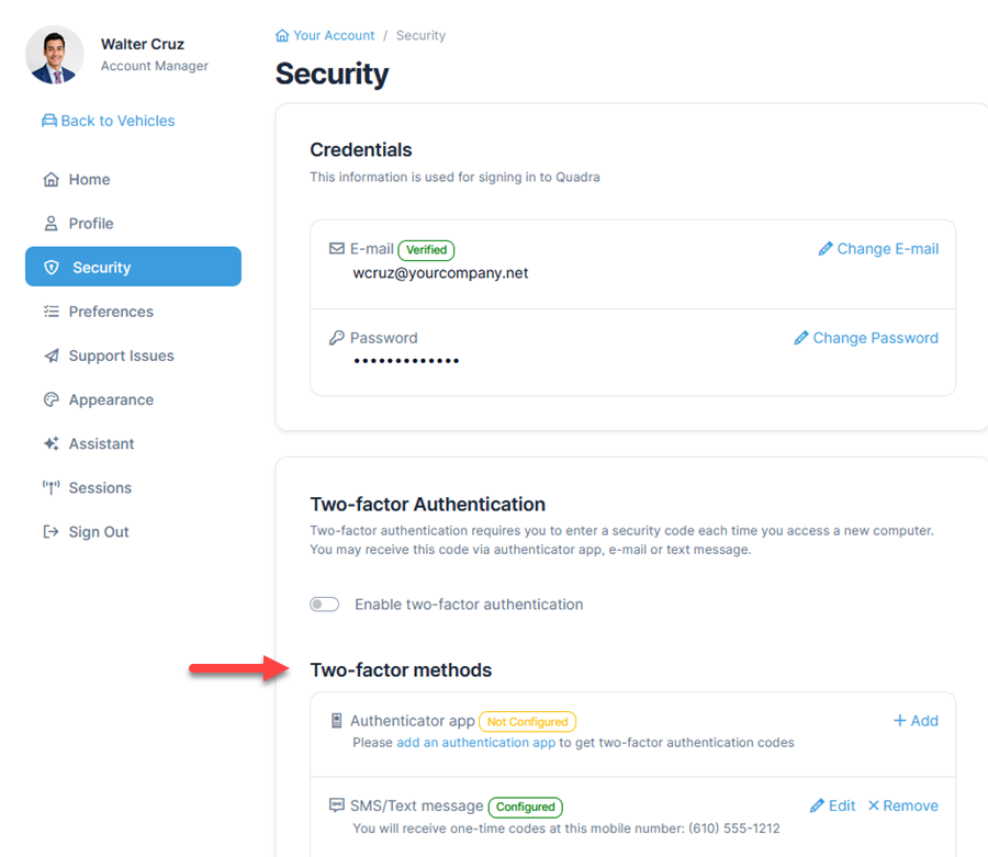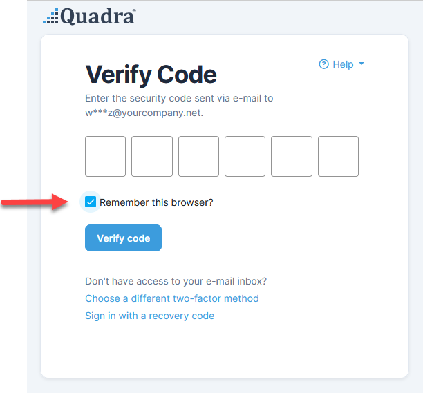 - When you access Quadra using two-factor authentication, a message will appear asking you to select a method of receipt for the six-digit verification code.