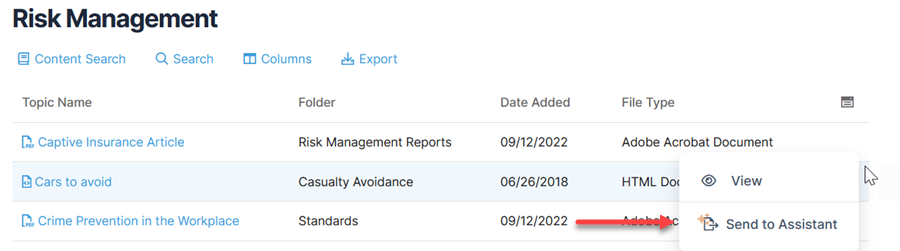 - Select a document from the list and under the action menu, click Send to Assistant.