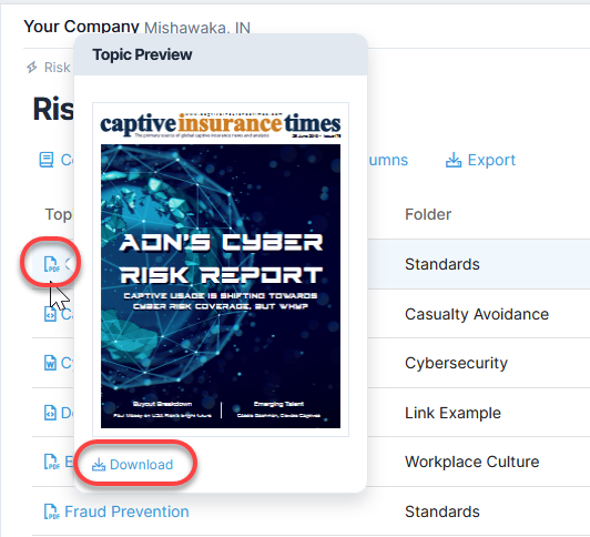 Previews are available for these file types: PDFs, Excel spreadsheets, Word documents, images and HTML files. Files in other formats can be stored in the Risk Management module, however you will only be able to download the documents when you click the icon.