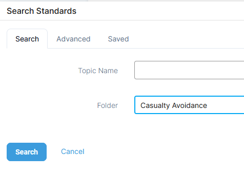 To view the list of topics for a specific folder, use the Search function and select a folder. Click Search for a filtered view of topics.