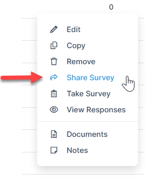 - Locate the survey within the list. Under the action menu, click Share Survey.