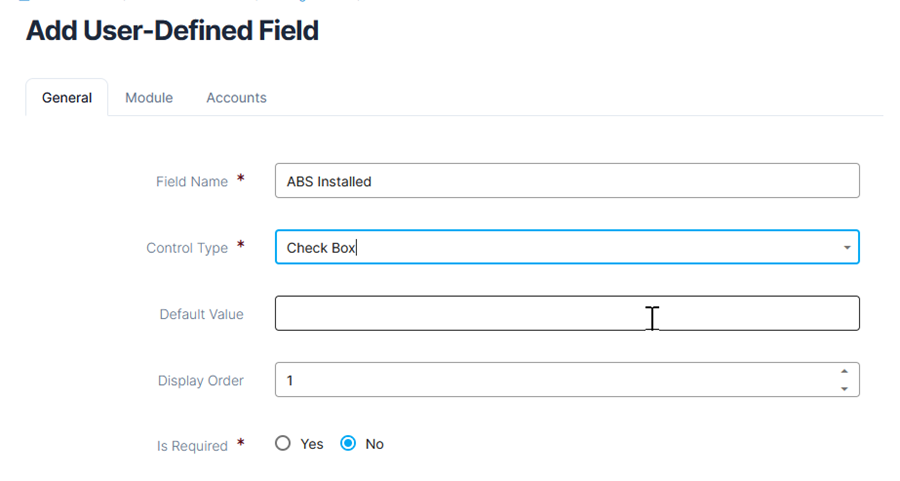 - For Display Order select a number. If you have multiple user-defined fields on a form together, this number will determine the order in which they will appear. If all fields are given the same number, they will sort by the order in which they were added.