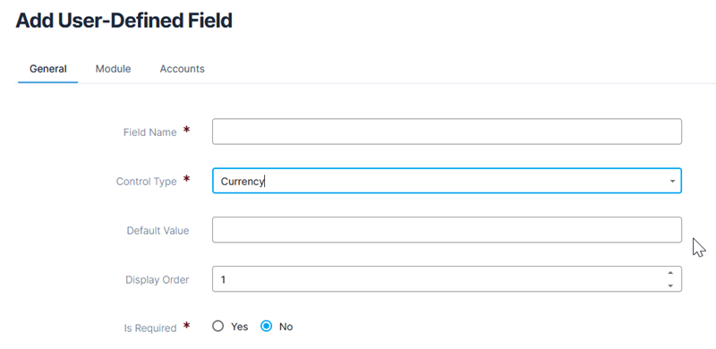 - Check the boxes for the Accounts in which this field will appear. If you don't select any accounts, the user-defined field will appear in all accounts.