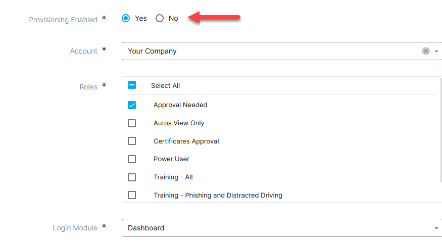 In this section, you can enable or disable user provisioning, and also select the account, roles, and login modules for the provisioned users.
