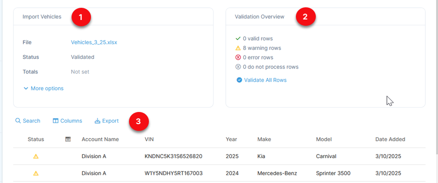 View information about the file and validated rows. More options displays selections made in the Choose Options sections. View details shows the validation results regarding quantity and/or count of records.