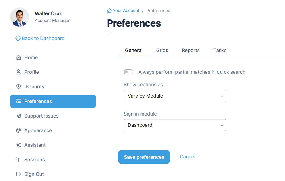 Remember my module grid search settings will store your grid search settings so the results in the grid will always match your search criteria. This setting is unchecked by default.