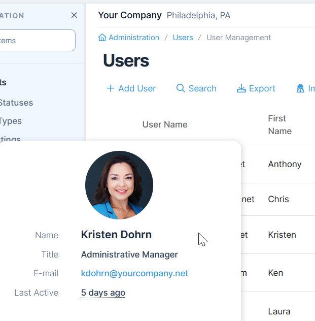 Note that if you click on another user's profile picture in Quadra, a pop-up window will display their name, title, email address, and when they were last active.